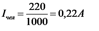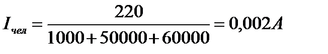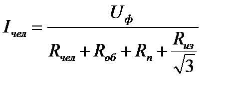 Рассмотрим наиболее неблагоприятный случай, когда человек стоит на сыром грунте или токопроводящем (металлическом) полу в сырой обуви. Тогда Rп = 0 и Rоб = 0, сопротивлением нейтрали, максимальное значение которого не превышает 4 Ом, можно пренебречь, а величина проходящего через человека тока составит: