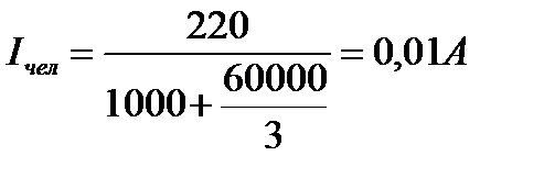 В расчетах сопротивление резиновой обуви принимается не менее 5 × 104 Ом, сухого пола из кирпича – не менее 11 × 106 Ом×м, линолеума – не менее 2 × 106 Ом×м, дубового паркета – не менее 1,7 × 106 Ом×м, бетона – не менее 0,6 × 106 Ом×м, изоляция проводов относительно земля – не менее 0,6 × 106 Ом. Мокрые полы имеют сопротивление во много раз меньше.