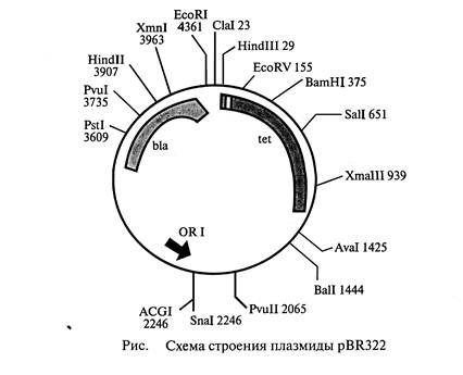 Плазмида pBR313 содержит уникальные участки расщеплений нескольких рестриктаз: EcoRI, Hindlll, BamHI, Sail, Xmal и Hpal. Конструируя рекомбинантную ДНК, в эти участки можно встраивать фрагменты чужеродной ДНК, полученные с помощью соответствующих рестриктаз.
