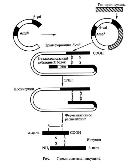 Работы по генно-инженерному получению инсулина начались около 20 лет назад. В 1978 г. появилось сообщение о получении штамма кишечной палочки, продуцирующего крысиный проинсулин (США). В этом же году были синтезированы отдельные цепи человеческого инсулина посредством экспрессии их синтетических генов в клетках Е. coli. Каждый из полученных синтетических генов последовательно подстраивался к 3 '-концу гена фермента (β-галактозидазы и вводился в векторную плазмиду (pBR322). Клетки Е. coli, трансформированные такими рекомбинантными плазмидами, производили гибридные (химерные, рекомбинантные) белки, состоящие из фрагмента β-галактозидазы, соединенной через остаток метионина с А и В цепями инсулина. При обработке in vitro химерного белка бромцианом пептид А-В высвобождался и далее ферментативно расщеплялся на фрагменты А и В. Однако замыкание дисульфидных мостиков между несвязанными С-пептидом А и В-звеньями инсулина происходило с трудом и данный метод получения инсулина не получил своего развития.