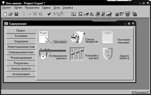 Окно содержит также и строку меню. Пункт «Проект» позволяет открывать и сохранять проекты, пункт «Обмен» позволяет передавать данные в другие программы серии Expert или сохранять их в текстовом формате, пункт «Результаты» позволяет посмотреть основные финансовые результаты инвестиционного проекта (прибыль, денежный поток и др.). Пункты «Сервис» и «Окно» позволяют настроить некоторые параметры программы (цвета, расположение окон и др.). Пункт «Справка» не нуждается в пояснениях.