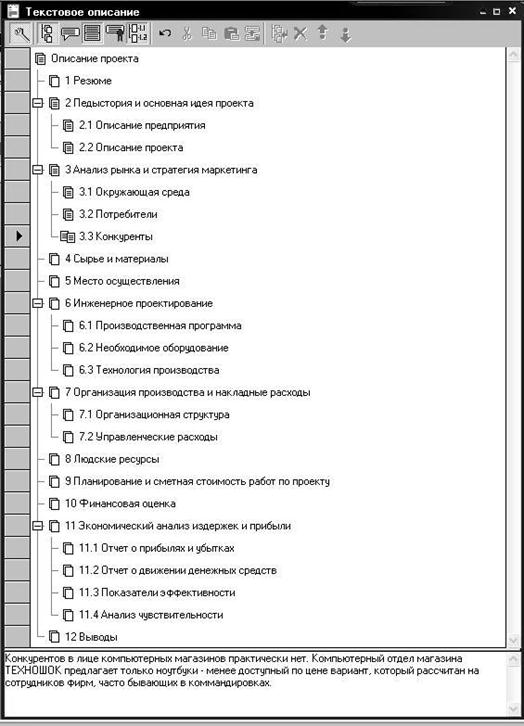 Некоторые разделы (например, «Анализ рынка…») могут состоять из нескольких пунктов. Процедура добавления пункта в раздел аналогична процедуре добавления нового раздела за исключением того, что на первом шаге курсор нужно поставить не в верхнюю позицию, а в позицию заголовка соответствующего раздела.