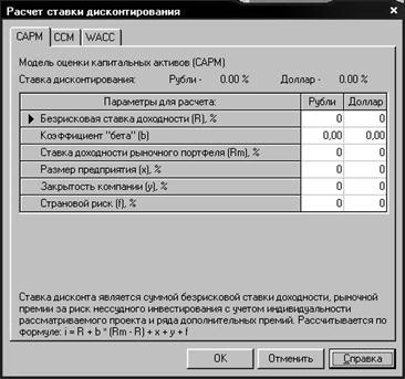 В данном окне можно задать необходимые данные для определения ставки дисконтирования по одной из трех методик: стоимости капитальных активов CAPM, средневзвешенной стоимости капитала WACC и кумулятивных построений CCM.