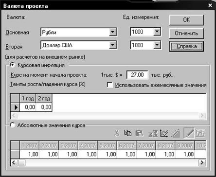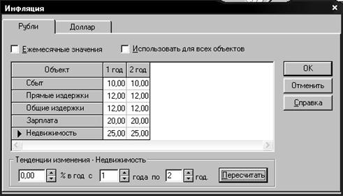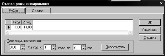 Представленные на рис. 10 и 11 диалоговые окна позволяют задать как абсолютные значения показателей для каждого года, так и задать тенденцию их изменения (т.е. величину годового прироста показателя). Если бы в нижней части окна «Ставка рефинансирования» на рис. 10 была бы указана тенденция 100% в год, то после нажатия кнопки «Пересчитать» во втором году проекта было бы установлено значение ставки 22%.