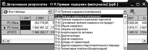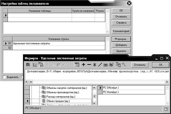 В данном случае показан пример расчета удельных постоянных расходов (отношение общих издержек и объема производства). В окне «Настройка таблиц пользователя» задается имя новой таблицы и название строки, в которой будет помещен результат вычислений по формуле. Процесс создания формулы, инициируемый кнопкой «Формула…», достаточно прост. В левой части выбирается таблица с исходными данными (например, объем продаж), в правой части – конкретный параметр (например, продажи РС Office), в верхней части с помощью кнопок со знаками арифметических действий строится формула, включающая несколько параметров. Нажатие на кнопку с изображением калькулятора (крайняя левая) запускает вычислительный алгоритм. Нажатие «ОК» завершает процесс.