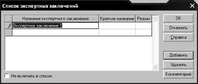 В появившемся диалоговом окошке (рис. 42) следует нажать кнопку «Добавить» - в списке заключений появится пункт «Экспертное заключение 1» (при желании название можно изменить). Нажатие кнопки «ОК» вернет в окно работы с заключением.