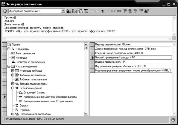 В качестве примера (рис. 43) можно рассмотреть создание простейшего экспертного заключения, в котором делается вывод об эффективности проекта по критерию NPV (для эффективного проекта NPV должно быть больше нуля).