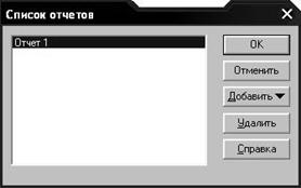 Результаты – Отчет. После вызова данного модуля на экран выводится список доступных отчетов (рис. 51). При первом запуске автоматически формируется Отчет №1, но пользователь при желании может создать несколько отчетов, используя кнопки «Добавить» и «Удалить». Чтобы приступить к редактированию отчета следует выделить его в списке и нажать кнопку «ОК».