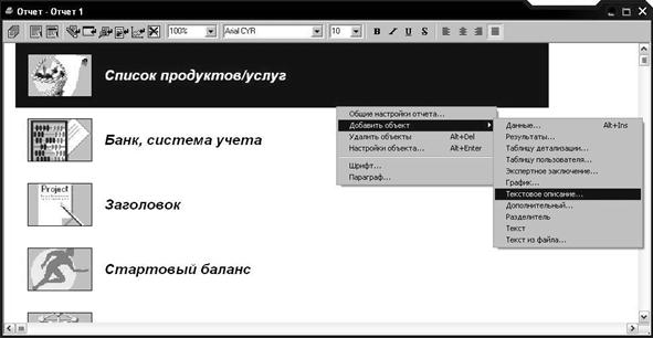 Например, в стандартном отчете отсутствует текстовое описание бизнес-плана, которое рассматривалось в п. 1.3 настоящего пособия. Для его вставки в отчет необходимо выбрать соответствующий пункт в меню (рис. 52).