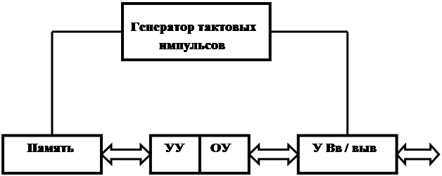Устройство управления вместе с операционным устройством образует «центральное операционное устройство» (ЦОУ), которое предназначено для извлечения из памяти команд рабочей программы, при помощи УУ, их декодирования и интеритации при помощи ОУ. При этом выполняются арифметические и логические операции, предусмотренные командами рабочей программы. Тактовый генератор обеспечивает синхронность выполнения всех операций, реализованных отдельными устройствами системы. В памяти хранится набор элементарных команд, который образует программу, управляющую функциями системы. Кроме того машина способна прерывать выполнение программы и вводить в неё изменения в зависимости от промежуточных результатов. Устройства вв./выв. предназначены для преобразования информации, поступающей в машину извне, передачи её в ЦОУ и выдачи результатов работы машины.