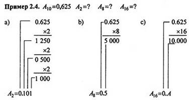 Дробное число с основанием N1 переводится в систему счисления с основанием N2 путем последовательного умножения An1 на основание N2, записанное в виде числа с основанием N1. При каждом умножении целая часть произведения берется в виде очередной цифры соответствующего разряда, а оставшаяся дробная часть принимается за новое множимое. Число умножений определяет разрядность полученного результата, представляющего число An1 в системе счисления N2.