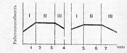 Развитие утомления связано с изменением работоспособности и в течение рабочей смены проходит три этапа: врабатывания, устойчивой работоспособности и наступления утомления (рис. 1.5).