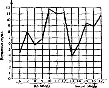 Изменение числа несчастных случаев в течение рабочего дня показано на рис. 1.6.