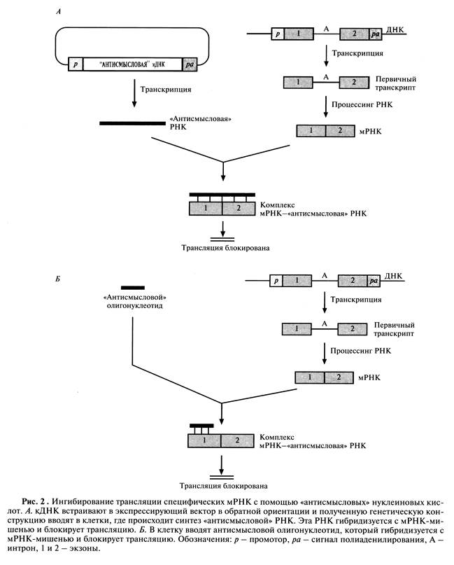 «Антисмысловая» РНК (Antisense RNA), которую предполагается использовать в качестве лекарственного средства, представляет собой короткий (15-20-нуклеотидов) олигонуклеотид, который может связываться с комплементарным ей определенным участком мРНК и ингибировать трансляцию кодируемого ей белка, подавляя тем самым патологический процесс (рис.2).