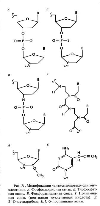 Синтезированы «антисмысловые» олигонуклеотиды с фосфорамидитной и полиамидной (пептидной) связями - пептидные нуклеиновые кислоты (Peptide nucleicacids, PNAs) (рис.3 В и Г ). Такие молекулы очень устойчивы к действию нуклеаз. Химические группы, присоединенные к 2'-углеродному атому сахарного остатка и С-5-атому пиримидинов, также защищают «антисмысловые» олигонуклеотиды и облегчают их связывание с сайтом-мишенью (рис. 3 2 Д и Е ). Все преимущества этих и других модификаций сейчас интенсивно изучаются.