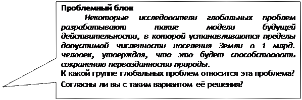 | Демографическая проблема | Регулирование прироста населения в регионах демографического «взрыва», стимулирование рождаемости в «стареющих» странах, политическая и социально-экономическая интеграция государств в единое планетарное сообщество, обеспечение интенсивного развития социально-экономической инфраструктуры в перенаселённых районах, равномерное распределение населения по территории планеты | |