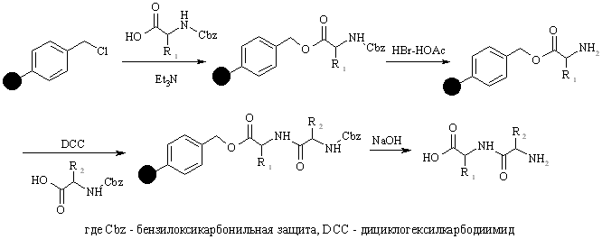Полимерный носитель в методе Меррифилда – это гранулированный сшитый полистирол, содержащий хлорметильные группы в бензольных ядрах, которые являются линкерами, связывающими подложку с первым аминокислотным остатком полипептида. Эти группы превращают полимер в функциональный аналог бензилхлорида и сообщают ему способность легко образовывать сложноэфирные связи при реакции с карбоксилат-анионами. Конденсация такой смолы с N-защищенными аминокислотами ведет к образованию соответствующих бензиловых эфиров. Удаление N-защиты из дает С-защищенное производное первой аминокислоты, ковалентно связанное с полимером. Аминоацилирование освобожденной аминогруппы N-защищенным производным второй аминокислоты с последующим удалением N-защиты приводит к аналогичному производному дипептида также привязанному к полимеру: