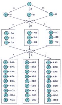 Так в 1982 году была предложена оригинальная стратегия многостадийного параллельного синтеза пептидов на твёрдой фазе известная как „сплит-метод“ (split — расщепление, разделение) или метод “смешай и раздели” (рис. 3). Суть ее состоит в следующем. Допустим, что из трёх аминокислот (А, В и С) нужно получить все возможные комбинации трипептидов. Для этого гранулы твёрдого полимерного носителя (Р) разделяют на три равные порции и обрабатывают их раствором одной из аминокислот. При этом все аминокислоты химически связываются с поверхностью полимера одной из своих функциональных групп. Полученные полимеры трёх сортов тщательно смешивают, и смесь опять разделяют на три части. Затем каждую часть, содержащую все три аминокислоты в одинаковых количествах, вновь обрабатывают одной из тех же трёх аминокислот и получают девять дипептидов (три смеси по три продукта). Ещё одно смешение, разделение на три равные части и обработка аминокислотами дают искомые 27 трипептидов (три смеси по девять продуктов) всего через девять стадий, тогда как получение их по отдельности потребовало бы синтеза из 27×3 = 81 стадий.