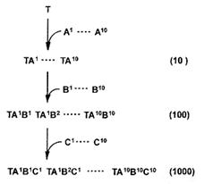 Рис. 4. Многостадийный комбинаторный синтез (дериватизация темплейта). Т — темплейт, А, В, С — билдинг-блоки последовательных стадий, ТА — интермедиаты первого уровня, TAB — интермедиаты второго уровня, ТАВС — комбинаторная библиотека