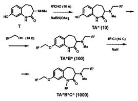 Многие комбинаторные библиотеки создают путём последовательной дериватизации (derivative - соединение, полученное из предшественника) исходного билдинг-блока, который еще называется „темплейт“ (templatе- образец, шаблон) (рис.4). Такой темплейт имеет определенную постоянную базовую структуру и несколько функциональных групп, которые на разных этапах синтеза последовательно реагируют с другими билдинг-блоками. Темплейт и интермедиаты (промежуточные продукты) первого уровня (рис.4) обычно нарабатывают в больших количествах (соответственно сотни и десятки граммов) обычным классическим синтезом, а затем проводят параллельный синтез.