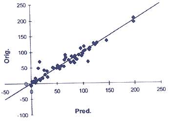 Рис. 6. Пример предсказания активности структур методом QSAR (сравнение экспериментальных и предсказанных данных по ингибированию замещенными индолами захвата Са»+) |