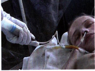 - Через нижний носовой ход введите зонд на глубину 15 – 18 см (голова запрокинута назад).