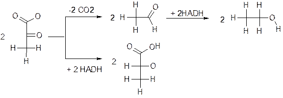 В основе многих бродильных процессов лежит универсальный, включающий в себя 9 реакций, процесс превращения глюкозы (источник углерода) в ключевой промежуточный продукт (интермедиат)-пировиноградную кислоту (ПВК) или пируват из которого далее могут образовываться различные конечные продукты. По конечному продукту, образующемуся в наибольшем количестве различают молочнокислое (молочная кислота - лактат), спиртовое (этанол), маслянокислое, ацетон-бутанольное и т.д.