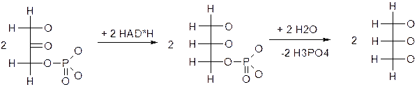 В таких условиях акцептором электронов (атомов водорода) от НАД*Н становится не ацетальдегид, как это происходит при нормальном протекании спиртового брожения, а фосфодиоксиацетон, превращающийся в глицерин-фосфат, гидролиз которого приводит к образованию глицерина. Образование этанола в этом случае не происходит.