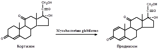Наиболее изученный и широко используемый в промышленности процесс- реакции окисления. Они объединяют гидроксилирование неакти-вированного углерода в sp3-гибридном состоянии (введение спиртовой группы ОН), окисление непредельных С=С связей, гидроксилирование ароматического кольца, дегидрирование, β-окисление жирных кислот, окисление спиртовой или альдегидной групп и т.д. Характерным примером таких реакций является дегидрирование стероидов с целью получения антивоспалительных стероидных препаратов преднизона, преднизолона и их производных:
