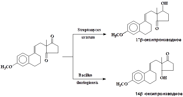 Микробное восстановление имеет преимущества перед многими химическими реакциями такого типа. Например, селективность действия микробных ферментов позволяет восстановить определенную кето-группу стероидов (химическим путем это невозможно). В синтезе стероидов эта особенность микроорганизмов используется очень широко, например, для восстановления 14а- или 17(3-кетогрупп) секостероидов ряда эстрана: