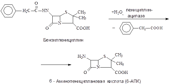 Реакции гидролиза чрезвычайно широко распространены в микробной химии. Они включают гидролиз эфиров, амидов и других соединений. Наиболее часто эти реакции используют в антибиотической промышленности и при производстве стероидов. Современное производство пенициллинов основано на синтезе различных производных 6-аминопенициллановой кислоты (6-АПК). Кислоту получают из бензилпенициллина ферментативным гидролизом: