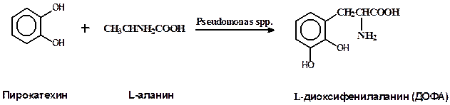 Большое значение имеет синтез аминокислот из предшественников. Конденсацией пирокатехина и его функциональных производных с аланином и серином удалось получить L-диоксифенилаланин— (ДОФА) — ценный лекарственный препарат, применяемый при болезни Паркинсона: