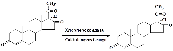 Реакция галогенирования редко встречается в микробном мире, но имеет особое значение, так как селективное галогенирование химическим путем – одна из самых сложных проблем химии. Она дает возможность получать галогенированные производные стероидов и других лекарственных препаратов. Наиболее изучен процесс галогенирования ферментом мицелия гриба Caldariomyces fumago, получившим название хлорпероксидазы. Фермент катализирует хлорирование кетокислот, циклических дикетонов, бромирование тиазолов, анизола, стероидов и т. д.