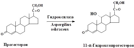 Биотрансформация стероидов обычно заключается в селективном воздействии на одно из положений стероидного скелета. Первый промышленный процесс микробной биотрансформации стероидов основывался на технологии направленного гидроксилирования (11-α-гидроксилирование) прогестерона: