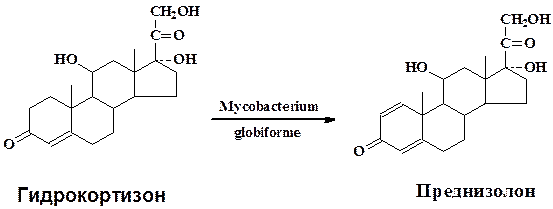 В качестве типичного примера микробиологической трансформации рассмотрим подробнее превращение гидрокортизона в преднизолон культурой Mycobacterium globiforme для которой характерны окислительно-восстановительные превращения стероидной молекулы(микроорганизм применяется в промышленности для получения стероидных гормонов):