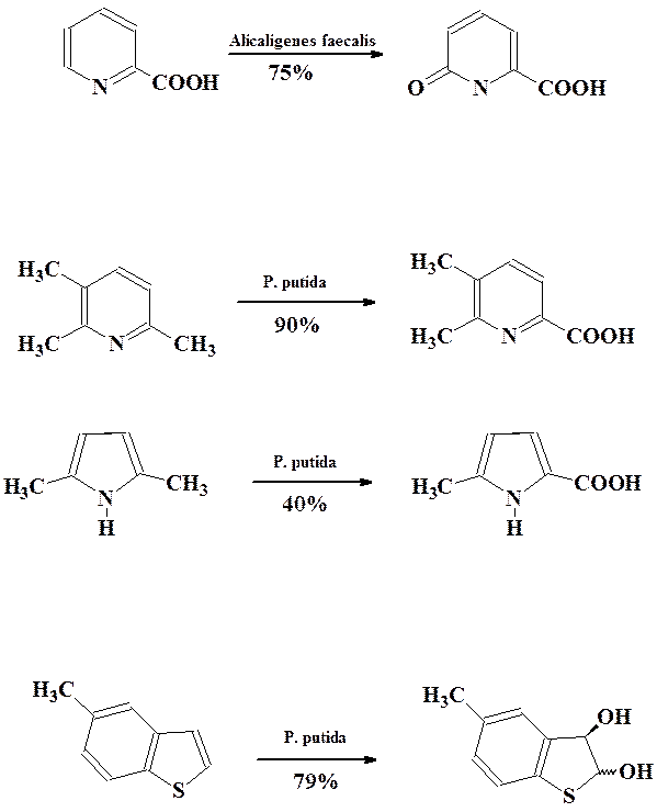 Среди гетероциклических соединений наиболее широко изучены процессы окисления пиридинов в пиридоны, селективное окисление боковых алкильных групп в различных гетероциклах, энантиоселективное цис-дигидроксилирование бензотиофенов и бензофуранов.