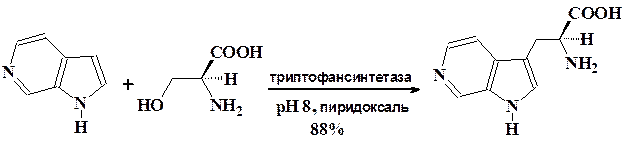 Поразительным примером возможностей микробной биотрансформа-ции является катализируемое ферментами введение аминокислотных фрагментов в 4-, 5-, 6-, 7-азаиндолы при алкилировании их серином.