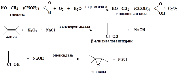 Ферментативный синтез окисей алкенов из алкенов, протекающей в водной среде, основан на 3 ферментах: глюкозозо-2-оксидазе из базидомицета Oudemansiella mucida, галопероксидазе из гриба Caldariomyces или других источников и эпоксидазе из Flavobacterium. На первом этапе синтеза глюкозозо-2-оксидаза вызывает образование перекиси водорода (Н2О2) из глюкозы, которая служит и субстратом, и источником энергии. На втором этапе, катализируемом галопероксидазой, перекись водорода взаимодействует с вводимыми в реакционную среду алкеном и галогенид-ионом (ионом фтора, хлора или брома) с образованием соответствующего β-алкангалогенгидрина. На последнем этапе водород гидроксильной (Н+) группы и галогенид-анион отщепляются под действием эпоксидазы, в результате чего получается окись соответствующего алкена.