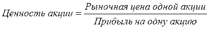 2. Коэффициент цена/прибыль на одну акцию отражает соотношение рыночной цены акции и прибыли на одну акцию. Этот коэффициент показывает, сколько денежных единиц согласны заплатить акционеры за одну денежную единицу чистой прибыли компании, и рассчитывается по следующей формуле: