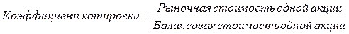 4. Коэффициент котировки показывает рыночную стоимость одной акции в сравнении с ее балансовой стоимостью и рассчитывается по формуле: