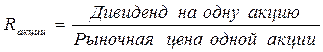 5. Для оценки доходности акций может быть рассчитано несколько показателей. Различают текущую и совокупную доходность акции. Под текущей доходностью понимают, прежде всего, дивиденды, которые получит владелец акции. Этот коэффициент называется дивидендным доходом или нормой дивиденда и рассчитывается по формуле: