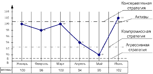 Линия 2 характеризует консервативную стратегию, в соответствии с которой долгосрочные пассивы поддерживаются на максимально необходимом уровне, то есть в размере 102 д. ед.