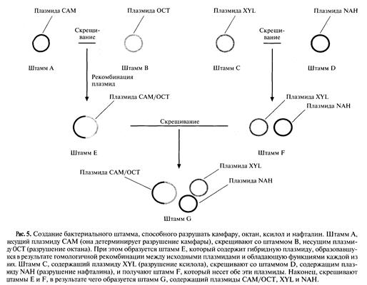 В 1970-х гг. Чакрабарти и его коллегами (США) был создан первый бактериальный штамм, обладающий более широкими катаболическими возможностями. Он расщеплял большинство углеводородов нефти и был назван «супербациллой». Для его получения использовали плазмиды, каждая из которых кодировала фермент, расщепляющий определенный класс углеводородов: плазмида САМ детерминировала деградацию камфары, ОСТ — октана, NAH — нафталина, XYL - ксилола (рис.5). Сначала путем конъюгации перенесли плазмиду САМ в штамм, несущий плазмиду ОСТ. Эти две плазмиды несовместимы (не могут существовать в одной клетке в виде отдельных плазмид), но в результате происходящей между ними рекомбинации образуется одна плазмида, объединяющая их функции. Затем аналогичным путем плазмиду NAH перенесли в штамм, несущий плазмиду XYL. Эти плазмиды совместимы и могут сосуществовать в одной клетке несли плазмиду САМ в штамм, несущий плазмиду ОСТ. Эти две плазмиды несовместимы (не могут существовать в одной клетке в виде отдельных плазмид), но в результате происходящей между ними рекомбинации образуется одна плазмида, объединяющая их функции. Затем аналогичным путем плазмиду NAH перенесли в штамм, несущий плазмиду XYL. Эти плазмиды совместимы и могут сосуществовать в одной клетке-хозяине. И, наконец, гибридную плазмиду перенесли в штамм, несущий плазмиды NAH и XYL. В результате всех этих манипуляций получили штамм, который растет на неочищенной нефти лучше исходных штаммов, взятых по отдельности или вместе.