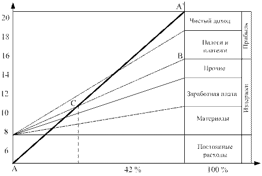 Можно заметить, что когда объем выпуска равен 0, совокупные издержки не равны нулю, а равны фиксированным элементам издержек. Для каждой конкретной цены продажи единицы конечного продукта, диагонально наклоненная линия АА′, начинающаяся в точке А, будет показывать величину доходов при различных объемах выпуска/продаж. Пересечение линии совокупного дохода с линией совокупных продаж определяет точку безубыточности (С). Любая разница по вертикали между линией совокупного дохода и совокупных издержек справа от точки С показывает прибыль при данном объеме производства, в то время как убытки будут показываться на графике слева от точки безубыточности, потому как в этом случае совокупные издержки превышают совокупный доход.