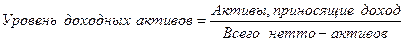 Уменьшение доходных активов также может привести к снижению доходов банка. По мнению экспертов фирмы «ИНЭК», разработчиков методики формирования описательной модели для анализа финансового состояния банка, нормальным считается, если доля активов, приносящих доход, в активах банка составляет 76 – 83 % [44]. Данный показатель предназначен для оценки активов с точки зрения их эффективности и рассчитывается по формуле: