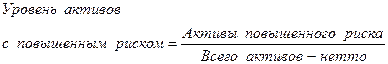 К активам повышенного риска относят ценные бумаги (за исключением государственных долговых обязательств), факторинг, лизинг, участия в капитале, просроченную задолженность, превышение дебиторской задолженности над кредиторской.