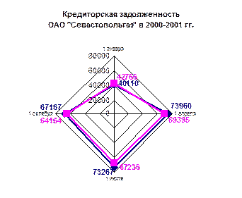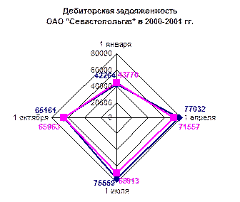 С целью анализа сезонности деятельности предприятия были проанализированы поквартальные данные финансовой отчётности за последние два финансовых года. Удалось установить, что в связи с сезонным характером потребления газа – в осенне – зимний период (в 1-м и 4-м квартале) оно возрастает - а также в связи с особенностями централизованного планирования газоснабжения, в 1-м квартале предприятие увеличивает валюту баланса приблизительно на 50,0 % за счёт увеличения кредиторской и соответственно дебиторской задолженности, затем же в течение года валюта баланса снижается до первоначального уровня, за счёт сокращения дебиторской, а соответственно и кредиторской задолженности. Такое впечатление, что баланс словно «разворачивается» в начале года, а затем «сворачивается». Данная тенденция чётко прослеживается при сопоставлении «лепестковых» диаграмм величин валюты баланса, дебиторской и кредиторской задолженности: