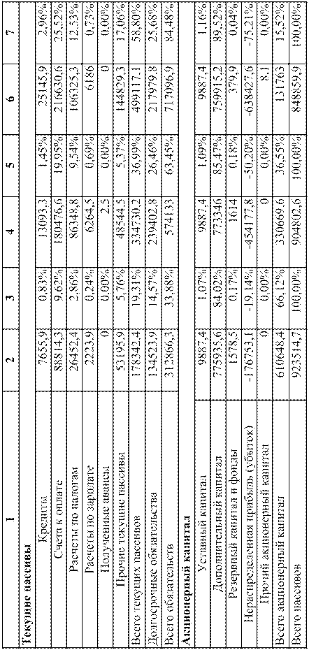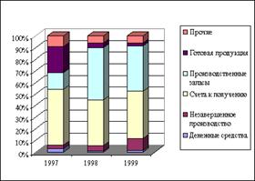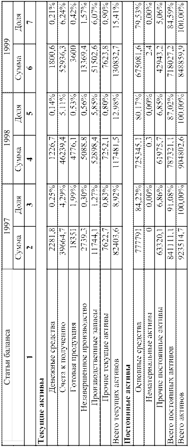 - в структуре пассивов по сравнению с 1997 годом наблюдался абсолютный и относительный рост текущих активов с 19,31 % в 1997 году до 58,80 % в 1999 году. Это было вызвано дальнейшим ростом задолженности по уплате налогов и по расчетам с кредиторами (соответственно на 9,66 % и 15,90 %). Удельный вес долгосрочных обязательств по сравнению с 1997 годом вырос на 11,11 % и на 01.01.2000 г. составил 25,68 % валюты баланса. Доля акционерного капитала незначительно выросла и в 1999 году составила 90,73 %. Убытки предприятия увеличились по сравнению с 1997 годом на 56,07 % и на 01.01.2000 г. составили 75,21 % валюты баланса.
