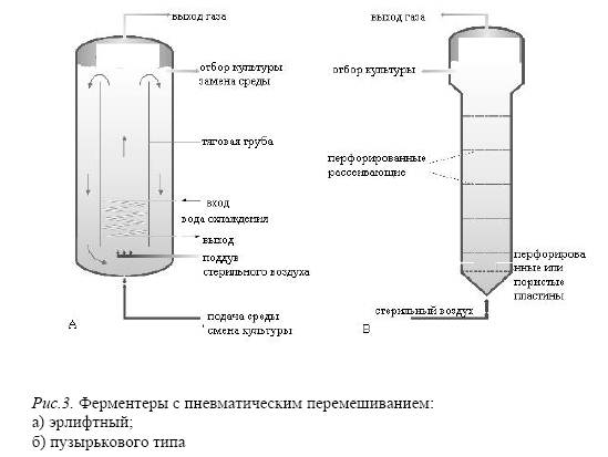 Общим признаком этих аппаратов является ввод энергии газовой фазой, которая является ее носителем и за счет которой осуществляется процесс перемешивания. Эта группа ферментеров характеризуется, прежде всего, простотой конструктивного исполнения и высокой эксплуатационной надежностью в связи с отсутствием движущихся узлов и деталей. В простейшем виде такой ферментер представляет собой сосуд в который через барботер подводится воздух или какая ни будь специальная газовая газовая смесь. Пузырьки, выходящие из барботера осуществляют процессы аэрирования, перемешивания и термостатирования в культуральной жидкости. Для улучшения процессов массо- и теплообмена используют различные конструктивные решения, направленные на прежде всего на более равномерное и быстрое распределение пузырьков воздуха по всему объему аппарата. Среди конструкций таких ферментеров наиболее распространены барботажные, барботажно-газлифтные, тарельчатые колонные, насадочные колонные и ряд других. Подвод или отвод (по необходимости) тепла в таких аппаратах осуществляется встроенными внутри аппарата теплообменниками различной конструкции.