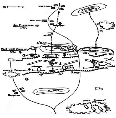 3. 1 мсв с танком № 130 из исходного положения (иск.) дорога, отд. дерево в направлении отд. дом, Митино атакует и уничтожает живую силу, установку ПТУР, пулемет и противотанковое орудие противника на вост. скатах выс. 140,0, в дальнейшем наступает в направлении выс. 140,0, Митино, Уваровка.